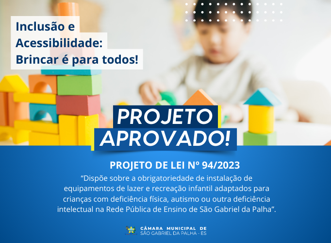 A Câmara Municipal de São Gabriel da Palha aprovou uma importante medida para inclusão e acessibilidade nas escolas da rede pública. Esse Projeto torna obrigatória a instalação de equipamentos de lazer e recreação adaptados para crianças com deficiência física, autismo ou outra deficiência intelectual.